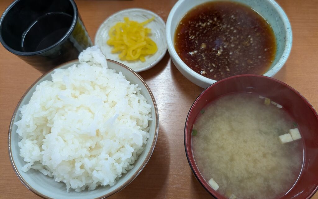 まずは、定食のごはんとみそ汁、漬物、天つゆがきます。